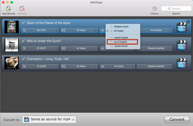 Nota: M4VGear para Mac y Windows mantiene la pista de audio 5.1 por defecto al elegir el formato de salida "Mismo como fuente para MP4" o "Mismo como fuente para MOV" para la conversión.